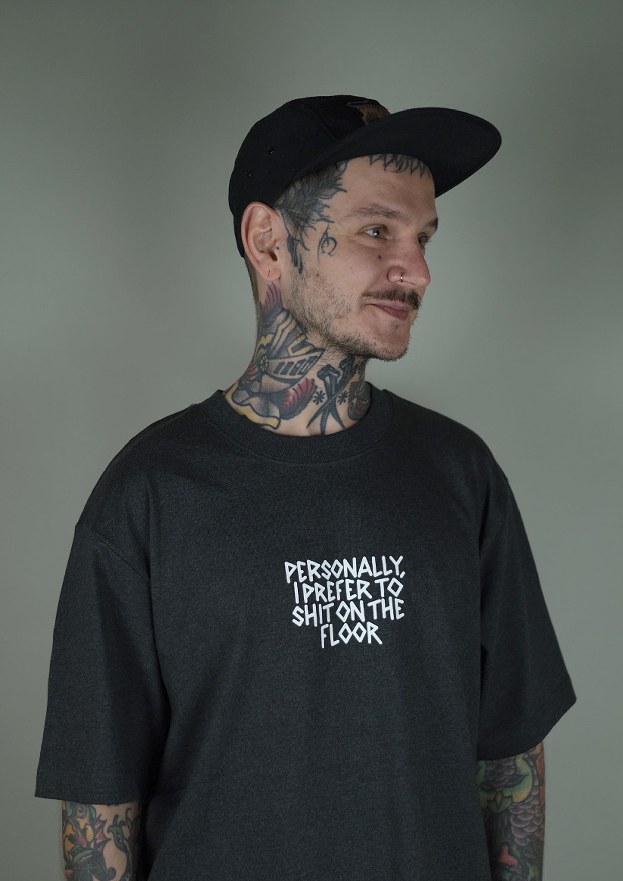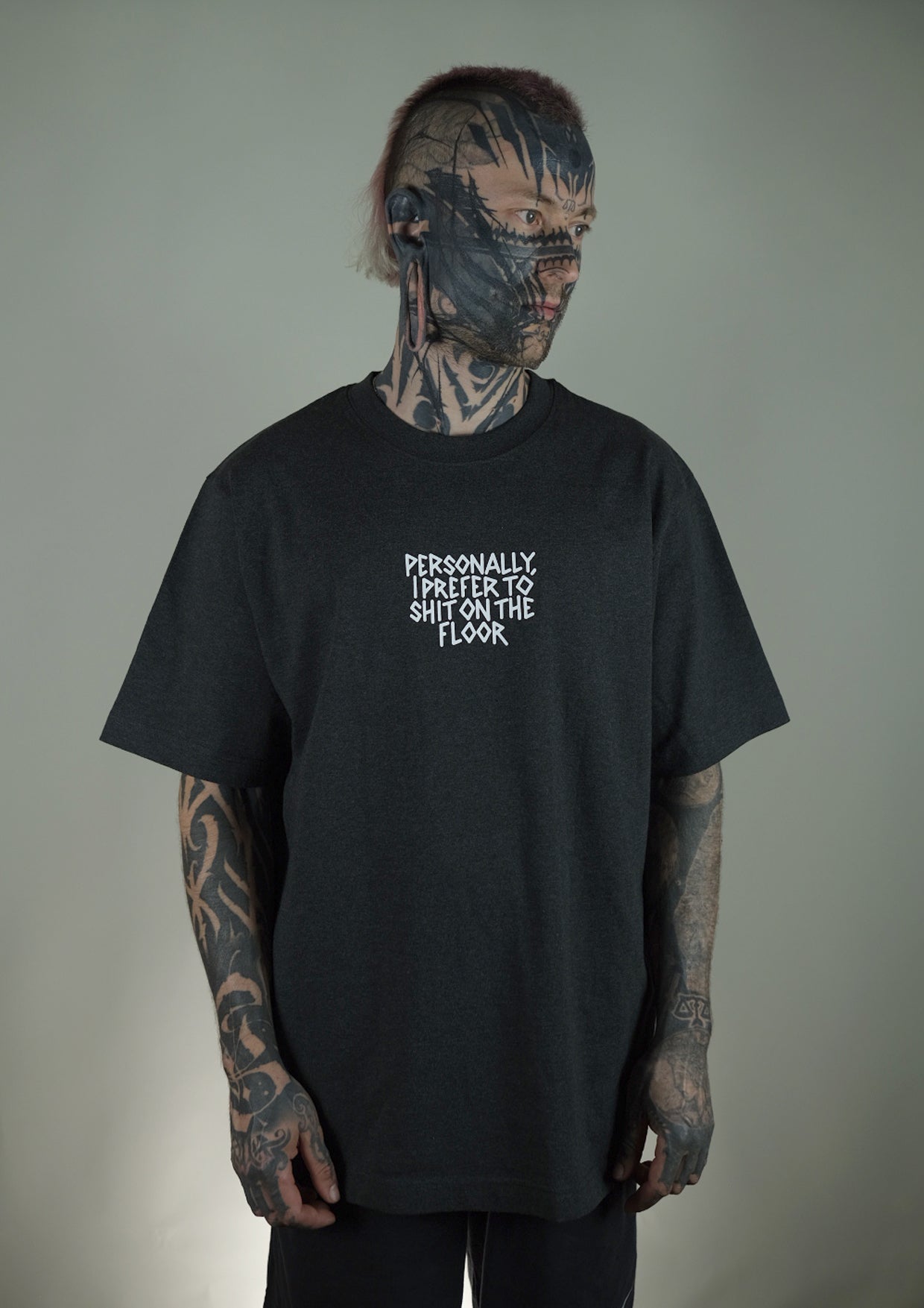 ... is a unisex, heavy weight shirt. The shirt is super comfy and you can feel the awesome quality. "PERSONALLY, I PREFER TO SHIT ON THE FLOOR" is a design made by IKIGAI.THREATS (Dan). Perfect fit for weddings, job interviews, or the first meet and greed with your partners family.
